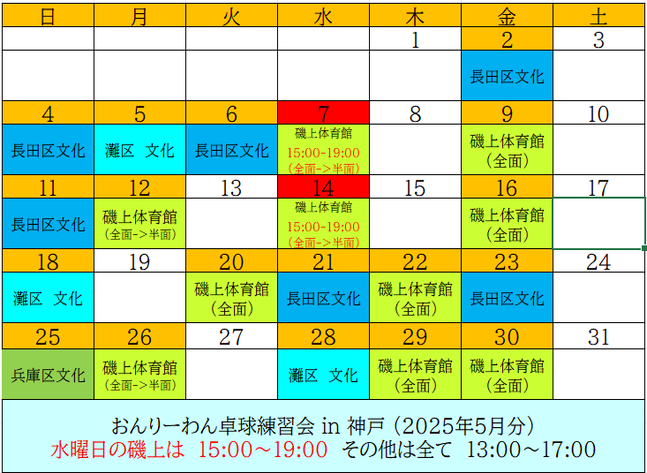 おんりーわん卓球練習会-in-神戸 2025年5月分