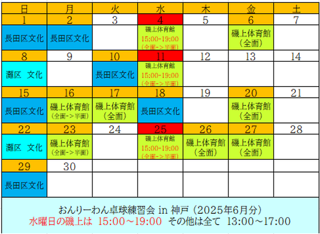 おんりーわん卓球練習会-in-神戸 2025年6月分