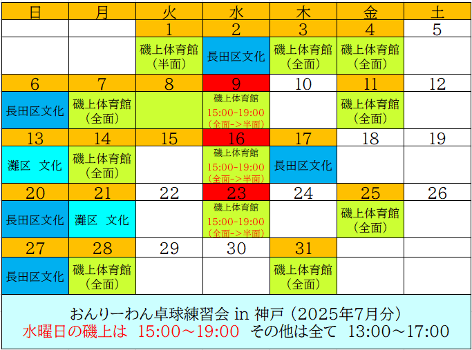 おんりーわん卓球練習会-in-神戸 2025年7月分
