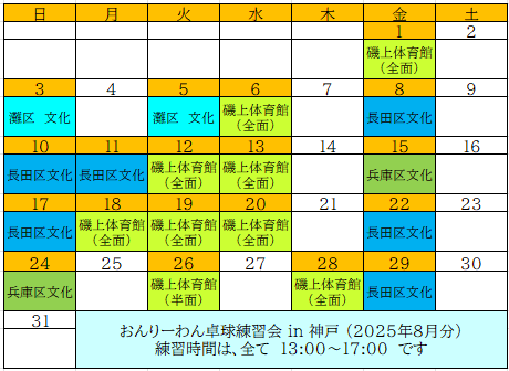 おんりーわん卓球練習会-in-神戸 2025年8月分