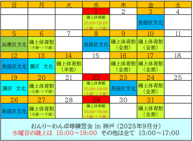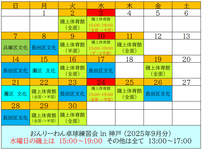 おんりーわん卓球練習会-in-神戸 2025年9月分
