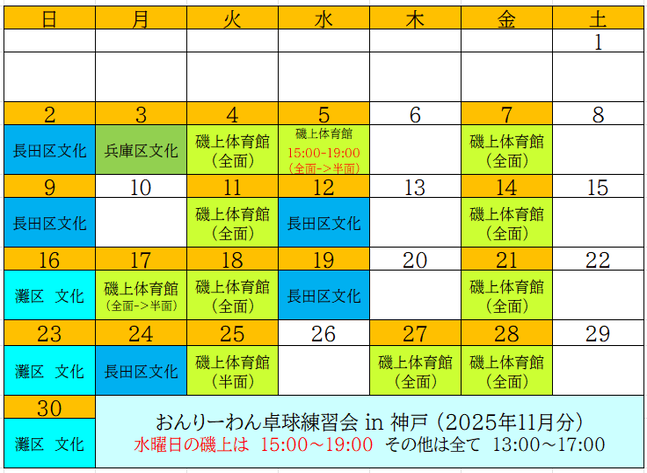 おんりーわん卓球練習会-in-神戸 2025年11月分