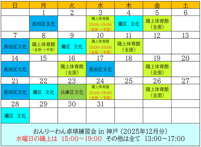 おんりーわん卓球練習会-in-神戸 2025年12月分