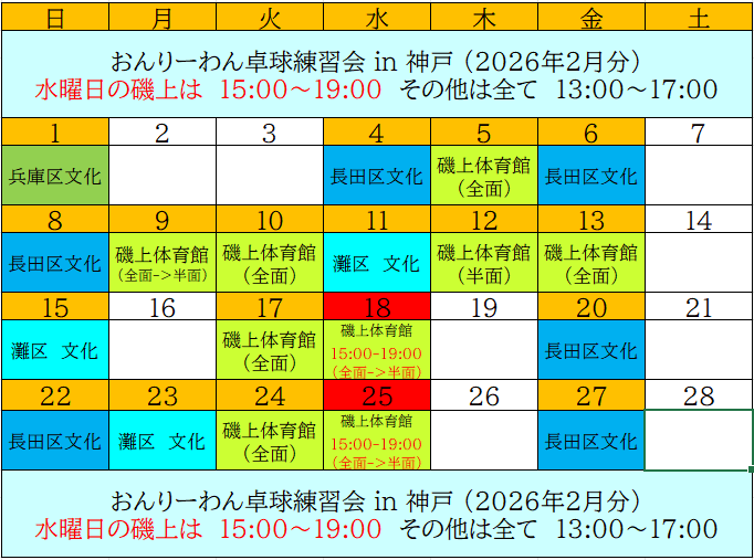 おんりーわん卓球練習会-in-神戸 2026年2月分